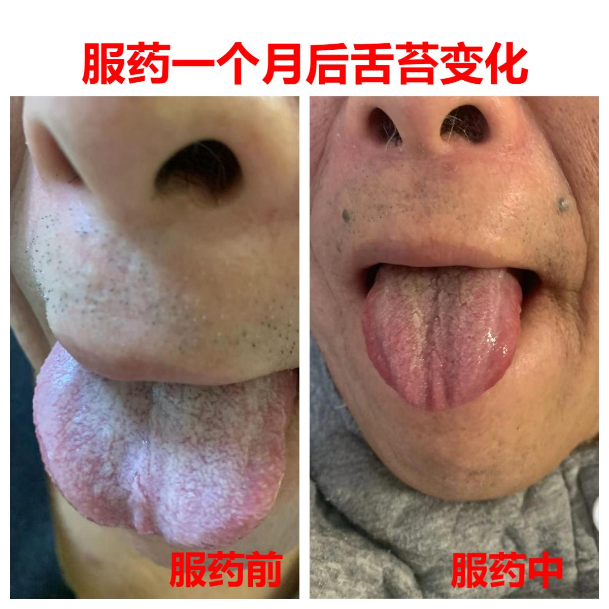 (服药前,舌苔厚腻,痰湿重、脾胃差、气血虚 服药一个月后,舌苔变淡,体质改善)